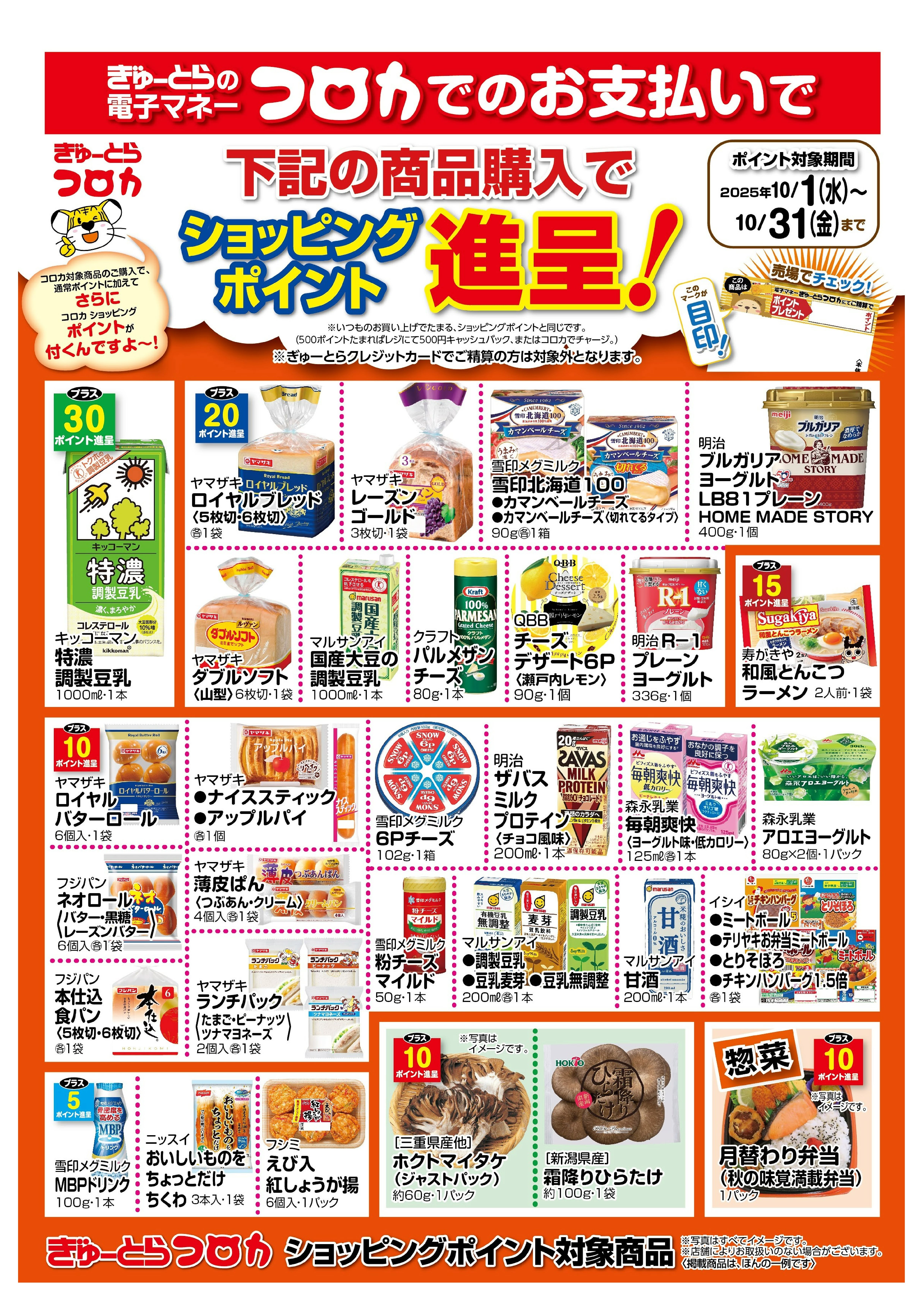 イチオシ ぎゅーとらコロカポイント_10月 2025.10.01 ぎゅーとらコロカ電子マネーでのお支払いでぎゅーとらショッピングポイントプレゼント!ポイント対象期間は2025年10/1(水)~10/31(金)まで