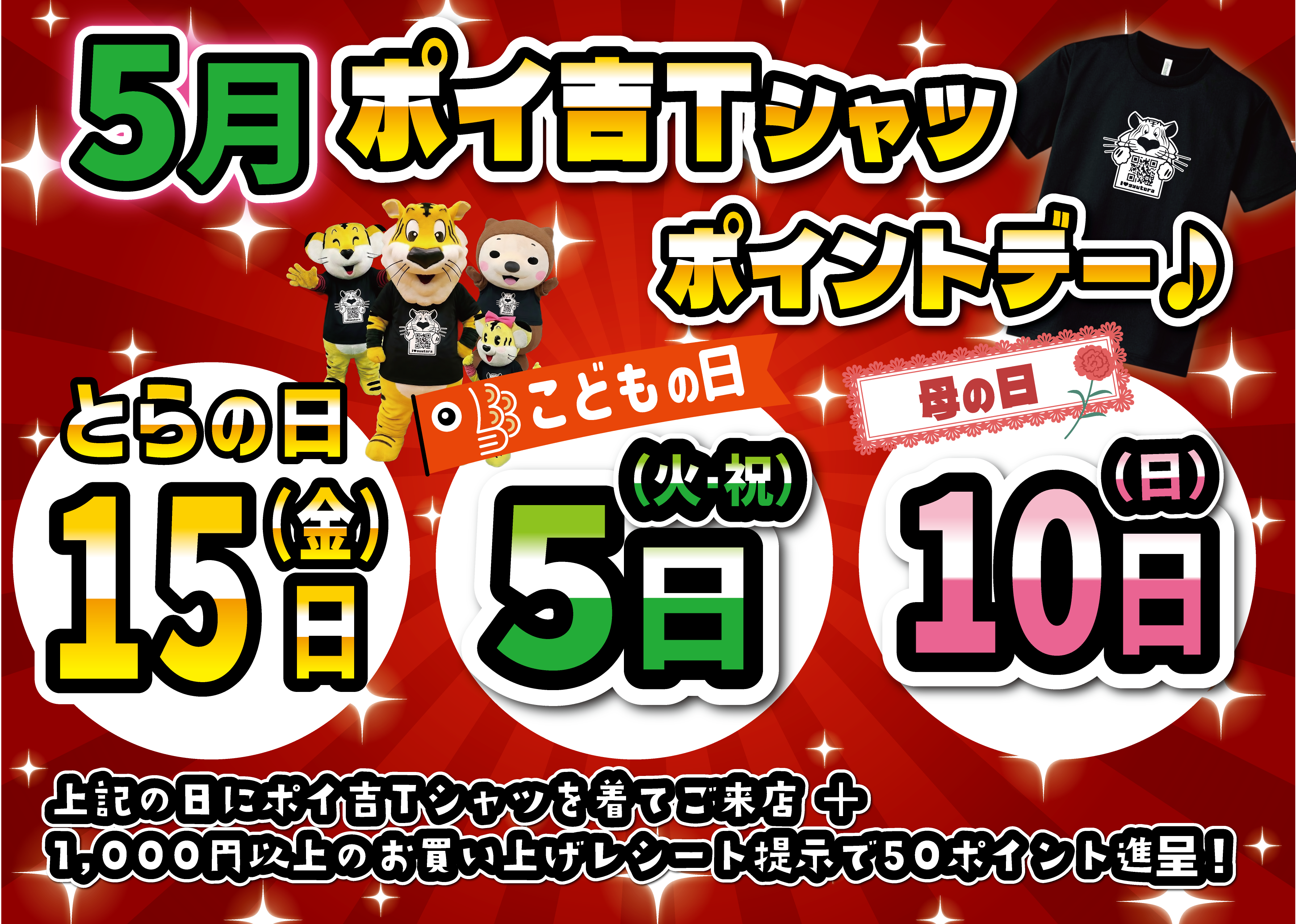 【 毎月15日 とらの日 】にポイ吉Tシャツを着てご来店&1,000円(税込)以上お買い上げで・・・