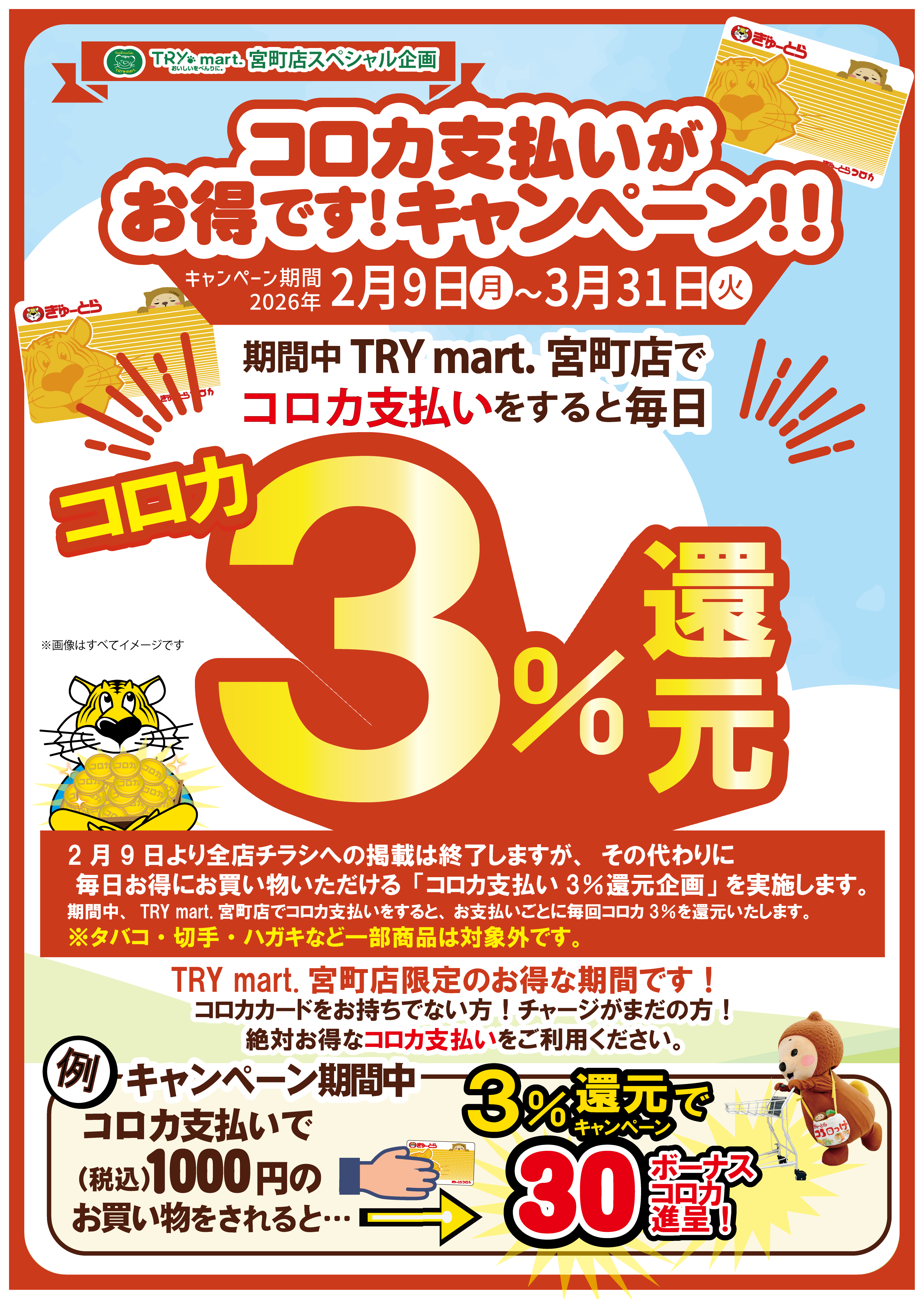 期間中、TRY mart.宮町店でコロカ支払いすると、お支払いごとに毎回コロカ3%を還元いたします。