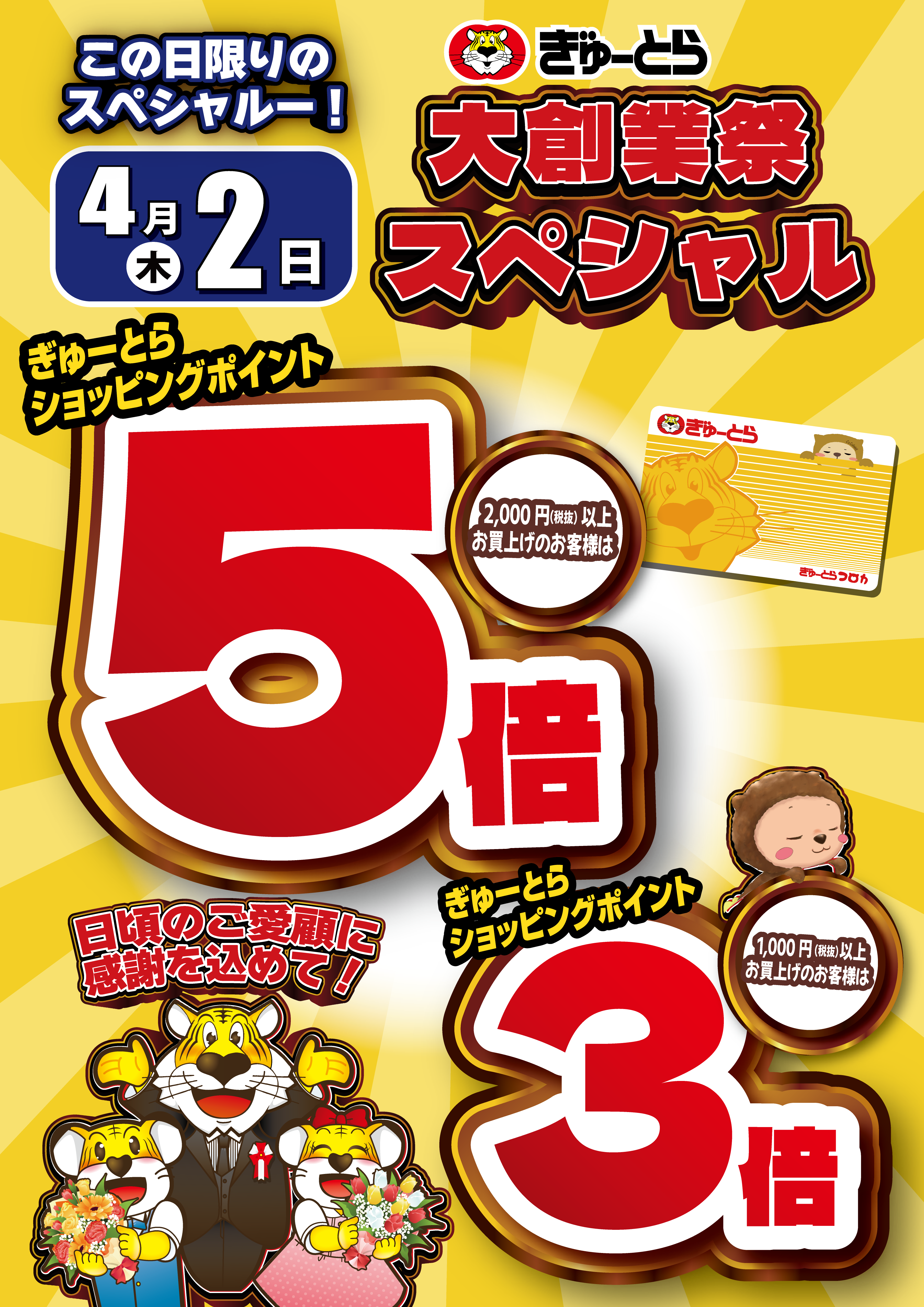 そして、4月2日(木)は、大創業祭スペシャルポイント3倍5倍デーを開催!